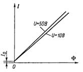 Фотодиоды представляют собой полупроводниковые диоды, р которых используется внутренний фотоэффект. Световой поток управляет обратным током фотодиодов. Под воздействием света на электронно-дырочный переход и прилегающие к нему области происходит генерация пар носителей заряда, проводимость диода возрастает и обратный ток увеличивается. Такой режим работы называется фотодиодным (рис. 13.3). Вольт-амперные характеристики I = f(U) при Ф = const для фотодиодного режима (рис. 13.4) напоминают выходные характеристики биполярного транзистора, включенного по схеме с общей базой. Если светового потока нет, то через фотодиод протекает обычный начальный обратный ток /0, который называют темповым. А под действием светового потока ток в диоде возрастает и характеристика располагается выше. Чем больше световой поток, тем больше ток. Повышение обратного напряжения на диоде незначительно увеличивает ток. Но при некотором напряжении возникает электрический пробой {штриховые участки характеристик). Энергетические характеристики фотодиода / = / (Ф) при U = const линейны и мало зависят от напряжения (рис. 13.5).