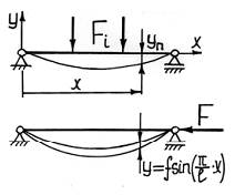 где Mп – изгибающий момент, вызванный только поперечной нагрузкой Fi; F – продольная сжимающая сила. Отсюда видно, что полный момент может быть найден только после того, как найден прогиб стержня, но, с другой стороны, прогиб нельзя найти, не зная момента. Запишем дифференциальное уравнение изогнутой оси балки: