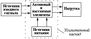ЛЕКЦИЯ 22 Структурная схема усилителя Электронным усилителем называется устройство, обеспечивающее увеличение мощности электрических сигналов, поступающих на его вход. В состав усилителя входят: 1) усилительный (активный) элемент – это нелинейный элемент (транзистор, электронная лампа и др.); 2) пассивные элементы: резистивные, емкостные, колебательный контур и др.; 3) источник питания (постоянного тока, реже переменного тока). Источником входных сигналов являются: микрофон, фотоэлемент, термопара, химический источник тока, предыдущий усилитель и др. Нагрузкой усилителя может быть: резистор, колебательный контур, трансформатор, электродвигатель, динамик и др. Назначение усилительного элемента – преобразовывать электрическую энергию источника питания в энергию усиливаемых сигналов. Простейший усилитель содержит один активный элемент с присоединенными к нему пассивными элементами, и он называется усилительным каскадом. Структурная схема усилительного каскада
