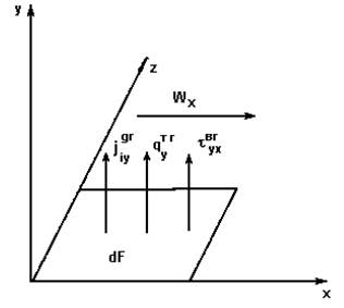 Рассмотрим элементарный, бесконечно малый участок межфазной поверхности dF. Прямоугольную систему координат расположим так (рис.7), чтобы плоскость X - Z совмещалась с поверхностью раздела фаз, а ось Х с направлением движения рассматриваемой фазы (поскольку участок межфазной поверхности выбран бесконечно малым, его можно считать плоским).