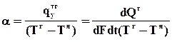 С использованием величины q* перепишем уравнение (89), решим его относительно dT и проинтегрируем, используя модель пограничного слоя, от границы раздела фаз до внешней границы слоя (dт). Температура при этом изменится от значения на межфазной поверхности (Тг) до значения в ядре фазы (Тя). Следует иметь ввиду, что коэффициент турбулентной теплопроводности является функцией расстояния от границы раздела фаз lт(y) и не может быть вынесен из под интеграла. Решив уравнение (91) относительно qутг, получим уравнение теплоотдачи. Выражение в его правой части, стоящее перед разностью температур, носит название коэффициента теплоотдачи Аналогичным образом могут быть получены уравнения массо- и импульсоотдачи, что позволяет использовать единую форму их представления и определить соответствующие коэффициенты