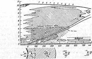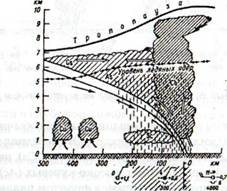 Рис. 3.4. Холодный фронт первого рода на вертикальном разрезе Давление перед самым фронтом сильно падает и на барограмме образуется характерный «грозовой нос» - острый пик, обращенный книзу. Ветер перед самым прохождением фронта поворачивает к нему, т.е. делает поворот влево. После прохождения фронта давление начинает расти, ветер круто поворачивает вправо. Если фронт располагается в хорошо выраженной ложбине, то поворот ветра иногда достигает 180°; например, южный ветер может смениться северным. С прохождением фронта наступает похолодание. На условия плавания при пересечении холодного фронта первого рода будет влиять ухудшение видимости в зоне осадков и шквалистый ветер. Холодный фронт второго рода. Это быстро движущийся фронт. Быстрое движение холодного воздуха приводит к очень интенсивному вытеснению предфронтального теплого воздуха и, как следствие этого, к мощному развитию кучевых облаков (рис. 3.5).