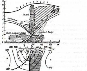 Рис. 3.5. Холодный фронт второго рода на вертикальном разрезе Кучево-дождевые облака на больших высотах обычно вытягиваются вперед на 60-70 миль от линии фронта. Эта передняя часть облачной системы наблюдается в виде перисто-слоистых (Cs), перисто-кучевых (Сс), а также чечевицеобразных высоко-кучевых (Ас) облаков. Давление перед приближающимся фронтом падает, но слабо, ветер поворачивает вправо и значительно усиливается - принимает характер штормового. Температура воздуха понижается иногда на 10°С за 1-2 ч. Условия плавания при пересечении такого фронта неблагоприятные, так как у самой линии фронта мощные восходящие токи воздуха способствуют образованию вихря с разрушительными скоростями ветра. Ширина такой зоны может достигать 30 миль. При слиянии фронтов может образовываться окклюзия по типу холодного фронта (рис. 3.6).