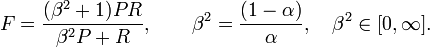 где Dnrel — это множество не релевантных документов в базе, а Dretr — множество документов, найденных системой. F-мера (F-measure, мера Ван Ризбергена) Иногда бывает полезно объединить точность и полноту в одной усреднённой величине. Для этой цели среднее арифметическое не подходит, так как, например, поисковой системе достаточно вернуть вообще все документы, чтобы обеспечить равную единице полноту при близкой к нулю точности, и среднее арифметическое точности и полноты будет не меньше 1/2. Среднее гармоническое не обладает этим недостатком, поскольку при большом отличии усредняемых значений приближается к минимальному из них. Поэтому хорошей мерой для совместной оценки точности и полноты является F-мера, которая определяется как взвешенное гармоническое среднее точности P и полноты R: