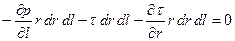 Кроме того, оговоримся, что не рассматриваем сейчас течение на входном участке трубы. Согласно условию прилипания, скорость частиц жидкости на стенке равна нулю. Когда поток входит в трубу, пристенные частицы «прилипают» к твердой поверхности и начинают подтормаживать соседние, находящиеся дальше от стенки и ближе к оси трубы. Постепенно влияние стенок распространяется на всю зону течения от стенки до оси трубы. Участок течения, где вблизи оси еще остались частицы, не затронутые влиянием стенок, называется начальным. Затем устанавливается так называемое стабилизированное течение. Опустим начальный участок, будем рассматривать только стабилизированное течение. Изобразим профиль скорости поперек трубы (рис.5-1). Выделим в цилиндрической системе координат (ЦВС) элементарный объем в виде колечка (рис.5-2), шириной Силам давления противостоят силы трения: Записываем баланс сил: