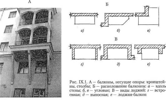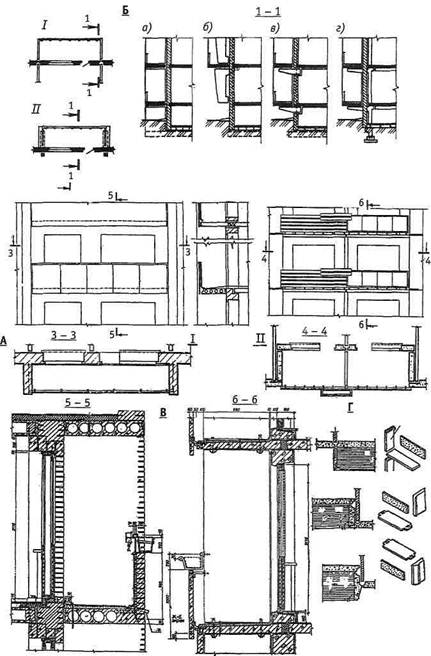 Рис. 1Х.6. Лоджии А — виды лоджий: I — выносная; II — встроенная. Б — опоры встроенных лоджий: а — приставные стенки на собственных фундаментах; б — стенки-кронштейны, опертые на поперечные несущие стены; в — то же, кронштейны; г — кронштейны каркаса. В — решения лоджий: несущий остов из кирпича или бетонных блоков; то же из сборных панелей