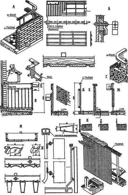 Рис. IX. 5. Детали балконов: А—И— ограждения; К— крепления ограждений; А — стенка в 1/2 кирпича; Б — деревянные или пластмассовые ограждения; В—Ж — металлическая решетка, с навеской: — листового стекла или листа пластмассы; Г— железобетонной стенки, облицованной керамической плиткой; Д — плоского асбестоцементного листа; Е — железобетонной панели; Ж — железобетона, отделенного металлическим листом; И — из гофрированных металлических листов и прессованных алюминиевых профилей рокинутых Г-образных рам, на которые уложены балконные плиты и бетонные цветники; результатом является весьма выразительный фасад, по существу сформированный балконами. Ограждения балконов могут выполняться из различных материалов: прозрачного и непрозрачного стекла, пластика, древесных материалов, волнистой листовой стали на каркасе и т.п. Некоторые примеры показаны на рис. 1Х.5. Высота ограждений многоэтажных зданий не менее 1,0 м, лучше 1,05 м, а для высотных зданий — 1,2 м и выше. При строительстве новых зданий, при реставрации старых, при проведении ремонтных работ широко применяется новая технология устройства балконов — система комплексных балконов, которая состоит из металлического несущего каркаса, бетонных плит и ограждения. Разработаны три конструктивные типа балконов: приставные, пристроенные и навесные. Они различаются, в основном, расположением несущего каркаса относительно стен фасада здания. Помимо временного назначения, система может быть использована как постоянная для реставрируемых и ремонтируемых зданий. Конструктивные решения лоджий во многом схожи с решениями балконов. Поскольку отличительной особенностью лоджий является наличие боковых стенок, то эти стенки и являются, главным образом, опорными для горизонтальных плит лоджий, особенно во встроенных лоджиях, не зависимо от того, в монолитном или в сборном вариантах эти стены осуществляются (рис. 1Х.6 Б). Особенность конструктивного решения выносных лоджий заключается в опасности возникновения разности осадочно-температурных деформаций стен лоджий и стен здания. Поэтому при большой этажности целесообразнее боковые «щеки» крепить на поперечные внутренние стены при помощи кронштейнов или карнизов (рис. 1Х.6 б, в, г) либо устанавливать «щеки» на карнизы каркаса (рис. 1Х.6 а). На рис. 1Х.6 Г рассмотрены все варианты устройства лоджий в сборном исполнении. Необходимо отметить, что лоджии, называемые также неотапливаемыми летними помещениями, подчас используются не по назначению (как подсобные кладовки, помещения для сушки белья и т.п.), что наносит ущерб внешнему виду здания. К тому же в большинстве районов нашей страны климатические условия не позволяют использовать лоджии по назначению большую часть года. Существуют различные приемы улучшения эстетического вида лоджий. Например, показанные на рис. 1Х.7 I широкие фасадные пилястры позволяют «спрятать» за ними хозяйственные вещи. Более эффективно введение остекления неотапливаемых лоджий, особенно остекления с металлизированными стеклами (рис. 1Х.7 III). Остекление лоджий выгодно, т.к. оно позволяет экономить до 30 % энергозатрат на отопление. Распашные окна менее эффективны, чем раздвижная система остекления из алюминиевых профилей (рис. 1Х.7 II и 1Х.7 IV). Последнее время получает распространение система, показанная на рис. 1Х.8: подвеше