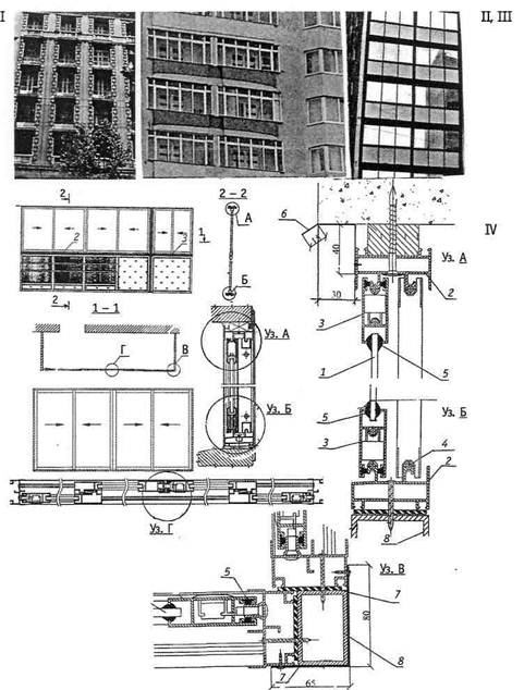 Рис. 1Х.7. Варианты эстетического решения лоджий: I — расширенные пилястры скрывают бытовое содержание лоджий (шкафы, белье и т.п.); II — лоджии, остекленные в процессе строительства; III — лоджии, остекленные с применением металлизированного стекла; IV — остекление с применением раздвижных металлических переплетов: 1 — стекло 8 4—6 мм; 2 — стационарный алюминиевый профиль с направляющими профилями; 3 — подвижный переплет; 4 — «направляющий» профиль; 5 — резиновая прокладка; 6 — отлив из оцинкованной стали Ъ - 0,5 мм; 7 — нащельпик из оцинкованной стали Ъ — 0,5 мм; 8 — труба стальная 60 х 40 х 3 мм
