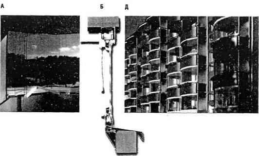 Рис. 1Х.8. Безрамное остекление: А, Б — прозрачное безрамное остекление балконов позволяет сохранить любое архитектурное решение; возможность свободного сегментирования позволяет остеклить балконы любой формы (системы безрамного остекления); В — сложная форма; Г — круглая форма; Д — общий вид