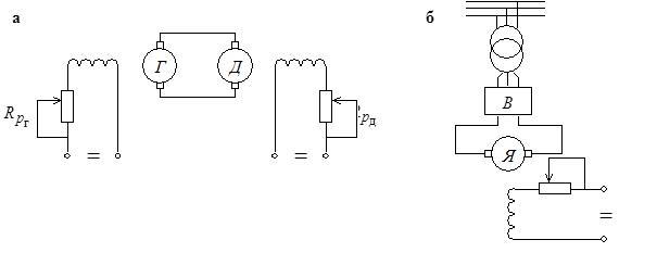 Для повышения электромагнитного момента при заданном пусковом токе и сокращения времени пуска необходимо стремиться к тому, чтобы поток Ф был максимален. Это условие выполняется при полностью выведенном регулировочном реостате ( Наиболее благоприятные пусковые характеристики могут быть получены при пуске двигателя от источника регулируемого напряжения. В качестве источника регулируемого напряжения используются либо генератор постоянного тока (рис. 2, а), либо полупроводниковый выпрямитель (рис. 2, б).