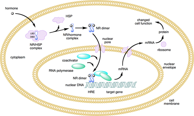 This figure depicts the mechanism of a class I NRs that, in the absence of ligand, is located in the cytosol. Hormone binding to the NR triggers dissociation of heat shock proteins, dimerization, and translocation to the nucleus, where the NR binds to a specific sequence of DNA known as a hormone response element. The nuclear receptor DNA complex in turn recruits other proteins that are responsible for transcription of downstream DNA into mRNA, which is eventually translated into protein, which results in a change in cell function.
