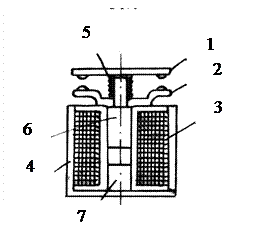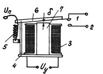 5.3. Электромагнитные реле Р е л е – это аппарат, который при определенном воздействии на его воспринимающую часть той или иной физической величины (тока, напряжения, частоты, силы света, температуры, давления и т. п.) срабатывает и исполнительная часть которого производит в управляемых им цепях необходимые переключения, вызывающие соответствующие изменения тех или иных физических величин (тока, напряжения и т. д.). Нейтральные электромагнитные реле являются простейшими и состоят (рис. 3) из катушки 3 с железным сердечником 7, ярма 4, якоря 6 с контактной группой, противодействующей пружиной 5, удерживающей якорь в определенном положении при отсутствии сил притяжения электромагнита. Между сердечником и якорем имеется воздушный зазор б.