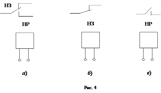 На схемах нейтральные реле с различными контактными группами изображаются так, как это показано на рис. 4, а, б, в. На рис. 4 изображены, соответственно, реле переключения (а), выключения (б) и включения (в). Рассмотренный тип реле предназначен для замыкания и размыкания цепей с относительно небольшими токами (1 ¸ 2 А).