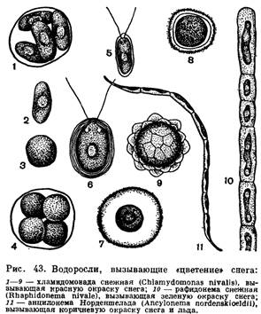 Исследования условий жизни в Антарктиде, проводимые экспедициями многих государств, принесли новые сведения о жизни микроорганизмов. Более 50 лет назад недалеко от Южного полюса на поверхности снега и льда вместе с замороженными водорослями были найдены и бактерии. Из образцов почвы, льда и различных органических остатков в Антарктиде удалось выделить многие виды психрофильных (холодостойких) микроорганизмов. На 1 г почвы получали от ста до нескольких тысяч клеток, даже на ледниках в 1 г льда обнаруживали до ста бактерий. В 1 г помета различных антарктических животных насчитывали от 3000 до 60 000 000 психрофильных бактерий. Микробиологов Сиднейского университета, специализировавшихся на изучении водорослей, заинтересовали коричневые полосы в толщах морского льда. Оказалось, что их создают мельчайшие диатомовые водоросли. Неподалеку от одной из антарктических станций диатомовые были найдены на нижней поверхности льда, толщина которого достигала полутора метров. Эти фотосинтезирующие микроорганизмы удовлетворялись тем слабым светом, который пробивался сквозь столь мощный слой. Позднее они были обнаружены в нижних слоях почти трехметрового льда. Эти слои менее плотны, чем наружные, и кристаллы льда чередуются здесь с капельками воды. В них-то и приютились диатомовые водоросли. Их количество учитывалось прямым подсчетом клеток, а также измерением содержания хлорофилла в биомассе организмов. В начале января 1963 года, то есть в середине антарктического лета, ученые установили присутствие 250 мг хлорофилла в 1 м3 льда. Таким образом, общая продукция хлорофилла в антарктических льдах достигает 300–600 тысяч тонн в год. Некоторые водоросли живут на поверхности снега, покрывающего горные вершины. Они окрашивают его в красный цвет. Среди них часто встречается вид Chlamydomonas nivalis, клетки которого содержат красные каротиноиды – пигмент, входящий в состав клеток моркови. В упомянутом выше труде Дарвина мы находим описание окрашенного водорослями снега на вершинах и гребнях Кордильер: «На нескольких покрытых снегом участках я нашел Protococcus nivalis – красный снег, так хорошо известный по описаниям арктических мореплавателей. Я обратил на него внимание, глядя на оставляемые мулами следы бледно-красного цвета, как будто копыта их были слегка окровавлены».