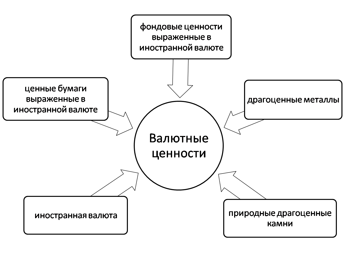 Объектом валютного рынка является комплекс общественных отношений (в основном в сфере экономики и ее регулирования государствами) по поводу обслуживания международного оборота товаров, услуг, работ; своевременного осуществления международных расчетов; стихийного определения валютных курсов путем балансирования спроса и предложения различных валют; предоставления механизмов защиты от валютных рисков; диверсификации валютных резервов банков, предприятий и государств; проведения валютных интервенций; использования рынка государствами для целей их денежно-кредитной и экономической политики; получения прибыли в виде разницы курсов валют и процентных ставок. Предметом, которым оперируют субъекты международного валютного рынка в процессе реализации общественных отношений, являются валютные ценности (рисунок 1.2). К валютным ценностям относятся: - иностранная валюта (денежные знаки и средства на счетах в денежных единицах иностранного государства, международных или расчетных денежных единицах); - ценные бумаги (чеки, векселя), фондовые ценности (акции, облигации) и другие долговые обязательства, выраженные в иностранной валюте; - драгоценные металлы (золото, серебро, платина, палладий, иридий, родий, рутений, осмий) и природные драгоценные камни (алмазы, рубины, изумруды, сапфиры, александриты, жемчуг).