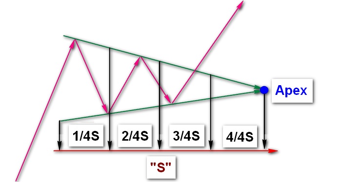 На изображении длина треугольника обозначена расстоянием «S». Точка пересечения границ треугольника (вершина) называется точкой «Apex». Расстояние «S» делится на 2 равных отрезка 1/2«S» и 2/2«S». Когда цена входит в треугольник, то наиболее вероятное место выхода из него – в направлении тренда. Однако зона 2/2«S» (правая половина треугольника) называется зоной Apex (зоной неопределенности).