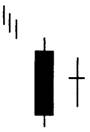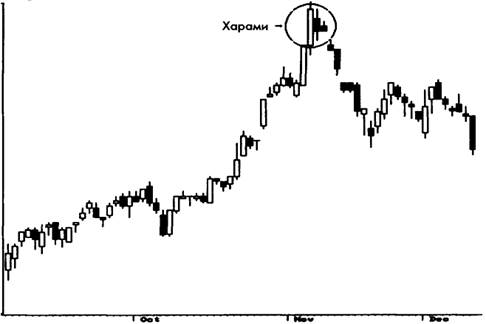 Модель харами состоит из большого тела, за которым следует меньшее. Именно относительные размеры этих двух тел делают харами важной. Вспомните, что дни возникновения доджи, когда цена открытия и цена закрытия равны, — это дни нерешительности. Таким образом, дни с маленьким телом, которые появляются после дней с более длинным телом, также могут представлять собой дни нерешительности. Чем больше такая нерешительность и неуверенность, тем более вероятно изменение тренда. Когда тело второго дня превращается в доджи, о модели говорят как о кресте харами (рис. 3-14 и 3-15), где крест — это доджи. Крест харами — более надежная разворотная модель, чем обычная харами.