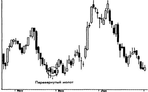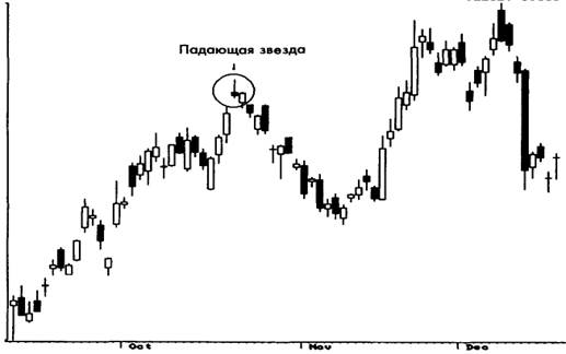 Несмотря на то, что перевернутый молот и падающая звезда рассматриваются как однодневные модели, чтобы повысить их надежность, следует рассматривать и предыдущие дни. Модель перевернутый молот сводится к длинной черной свече, которая сама по себе всегда рассматривается как медвежий знак (рис. 3-21). Падающая звезда сводится к длинной белой свече, которая почти всегда рассматривается как свеча бычья (рис. 3-22). Обе эти модели находятся в прямом противоречии с характером свечи, полученной в результате преобразования. Это указывает на необходимость получить подтверждение перед тем, как предпринимать какие-либо действия, основываясь на этих моделях.