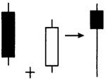 Утренняя доджи-звезда сводится к молоягу (рис. 3-42), а иногда и к доджи-дракону. Вечерняя доджи-звезда сводится к падающей звезде (рис. 3-43), а иногда к доджи-надгробию. Чем ближе редуцированная модель к доджи, тем сильнее модель, поскольку цена закрытия третьего дня уходит дальше внутрь тела первого дня.
