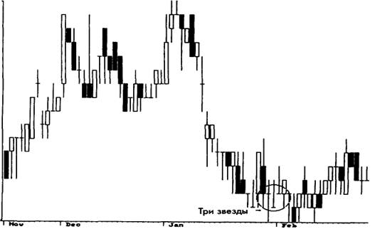 Модель три звезды сводится к волчку, который указывает на нерешительность рынка (рис. 3-52 и 3-53). Это определенного рода конфликт с моделью, который подтверждает мысль о том, что из-за редкости модели на нее следовало бы смотреть с долей скептицизма.