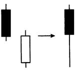 Когда формируется длинный черный день, рынок находится в понижательном тренде, и этот день сказывается полностью в контексте данного тренда. Следующий день открывается с разрывом вниз, затем на протяжении дня цены растут, чтобы закрыться на том же самом уровне, что и в предыдущий день. Следовательно, очень высоки шансы на то, что будет разворот. Если третий день откроется еще выше, будет получено подтверждение. Модель встречающихся свечей должна состоять из двух длинных свечей. Однако во многих случаях второй день не такой длинный, как первый. По-видимому, это мало влияет на надежность модели: подтверждение все равно предполагается. Кроме того, лучше всего, если каждый день представляет собой марибозу закрытия.