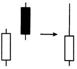 Встречающиеся свечи сводятся к единственной свече, которая не поддерживает толкование мод ели (рис. 3-60иЗ-61). Эта единственная свеча сходна с первой свечой модели, но ее тень удлиняется в сторону направления второго дня. Преобразование не только не поддерживает саму модель, но и не указывает на недостаток ее силы.