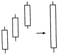 Цена открытия второго и третьего дня может быть в любой точке предшествующего тела. Тем не менее лучше, если цена открытия находится над срединной точкой тела предыдущего дня. Помните о том, что, когда открывается торговая сессия, на рынке должно присутствовать достаточно большое количество медведей, чтобы день открылся ниже предыдущей цены закрытия. Это предполагает, что здоровый рост всегда сопровождается некоторым сопротивлением.