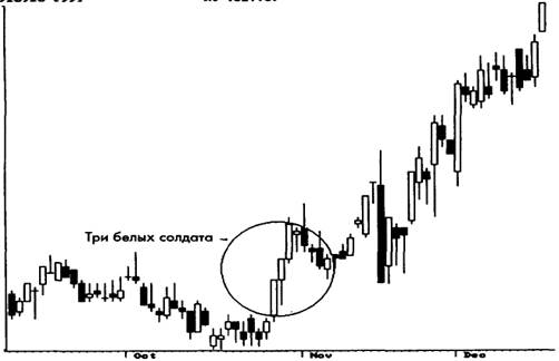 Модель три белых солдата сводится к очень длинной белой бычьей свече (рис. 3-70). Это полностью поддерживает характер модели, что делает подтверждение излишним.