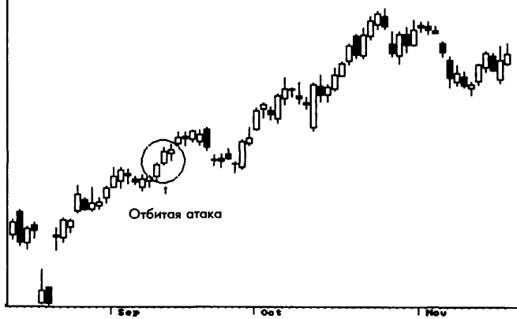 Как показано на рис. 3-75, модель размышление также является вариацией модели три белых солдата. Две первые длинные белые свечи достигают новых максимумов, а за ними следует маленькая белая свеча или звезда. Некоторые источники называют эту модель моделью торможения. Лучше всего, если между вторым и последним днем существует разрыв вверх. Обладая маленьким телом, последний день указывает на нерешительность, которая может остановить повышательное движение. Эта нерешительность и является временем размышления. Последующее подтверждение может с легкостью превратить эту модель в вечернюю звезду.