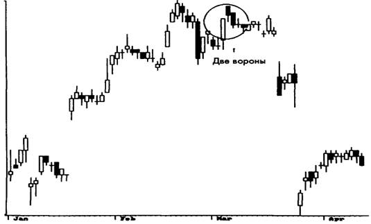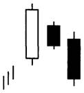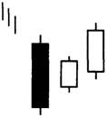 Модели три дня изнутри вверх и три дня изнутри вниз являются подтверждениями для модели хорами. Как показано на рис. 3-92 и 3-93, первые два дня этих моделей — именно хорами. Третий день дает подтверждающую цену закрытия как в бычьем, так и в медвежьем случаях. Бычья хорами, за которой на третий день следует более высокое закрытие, окажется моделью три дня изнутри вверх. Аналогичным образом медвежья хорами с более низкой ценой закрытия на третий день будет моделью три дня изнутри вниз.