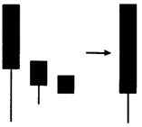Имеет место понижательный тренд, когда после образования нового минимума рост цен приводит к закрытию торговой сессии на уровне, значительно превышающем дневной минимум. Это вызовет некоторую обеспокоенность игроков, имеющих короткие позиции, поскольку указывает на покупательные силы, которые до этого момента не проявлялись. Следующий день открывается выше, что позволяет некоторым игрокам с длинными позициями закрыть их. Однако цена открытия оказывается дневным максимумом. Торговля ведется на более низком уровне, но все же выше, чем накануне, что приводит к закрытию сессии над ее минимумом. Теперь в силу более высокого минимума медведи, несомненно, обеспокоены. Последняя свеча — это день нерешительности, с очень незначительным движением цены. Каждый, кто еще остался в короткой позиции, не захочет увидеть дальнейший рост цен.