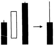 Прилипший сэндвич сводится к перевернутому молоту, в случае если тело первого дня заметно меньше, чем торговый диапазон третьего дня (рис. 3-109). Если тело первого дня мало, а ценовой диапазон третьего дня (от максимума до минимума) в два или три раза больше диапазона первого дня, эта модель сводится к бычьему перевернутому молоту. Однако, если все эти условия не выполняются, прилипший сэндвич сводится к черной свече, которая обычно рассматривается как медвежья. В результате модель требует подтверждения.