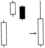 Верхний разрыв macyxu сводится к длинной свече с белым телом в нижней части ценового диапазона (рис. 4-3). Единственной опорой тут может быть тот факт, что редуцированная модель — длинная белая свеча, которую обычно рассматривают как бычью. Нижний разрыв тасуки сводится к длинной черной свече, которая обычно бывает медвежьей. Из-за недостатка строгости такого разбиения рекомендуется подождать подтверждения.