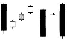 Метод трех поднимающихся сводится к длинной белой свече, которая полностью поддерживает продолжение бычьей тенденции (рис. 4-13). Метод трех падающих сводится к длинной черной свече, которая полностью поддерживает продолжение медвежьего тренда (рис. 4-14).