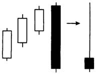 1. Понижательный тренд продолжается комбинацией, сходной с моделью три черные вороны. 2. На четвертый день рынок открывается еще ниже, чтобы потом вырасти и закрыться выше цены открытия первого черного дня.