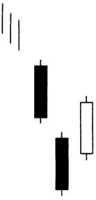 Это упрощенная модель, очень похожая на верхний и нижний разрывы тасуки и появляющаяся на рынках с сильным трендом. Разрыв возникает между двумя свечами одного и того же цвета (см. рис. 4-29 и 4-30); цвет должен отражать существующий на рынке тренд. Третий день открывается внутри тела второй свечи, а затем закрывается внутри тела первой свечи, как бы возводя мост между первой и второй свечами. Тело третьей свечи имеет цвет, противоположный двум первым. В традиционной терминологии это заполняло бы разрыв.