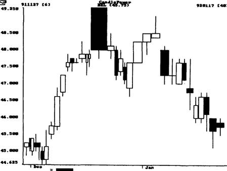 Обратите внимание: на графике Citicorp (CCI) каждая разворотная точка рынка сопровождается большим объемом торговли (рис. 9-4). Рынок достигает дна при большом черном дне, затем растет. Рост останавливается большим белым днем, затем возникают боковые движения вплоть до появления еще одного большого белого дня. Отсюда цена дважды совершает разрывы, за которыми следуют два дня нерешительности (волчки), оба с большим объемом. И здесь волчки с большим объемом снова поддерживают на рынке нерешительность. Большое количество акций переходит из рук в руки, но ни одна из сторон не берет верх. РИСУНОК 9-5