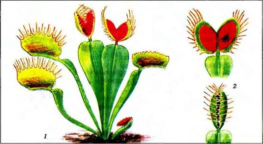 Минеральное питание растений. ВидВспомните! Сфагновые мхи, сфагноьне болота. Желудочный сок. Розетка. О том, что животные поедают растения, давно всем известно. А знаете ли вы, что некоторые растения «ловят» и «поедают» животных? Такие растения-хищники обитают и у нас, в средней части России, например росянки, живущие на сфагновых болотах, пузырчатки, обитающие в водоемах. Познакомимся с ними подробнее. Росянки. Эти небольшие, высотой 5-8 см, многолетние травянистые растения имеют розеточные побеги и мелкие белые цветки, собранные в соцветие на длинном цветоносе. На сфагновых болотах европейской России встречаются два вида росянок (рис. 53) — росянка круглолистная с округлыми листовыми пластинками и росянка английская с пр одолговатыми листовыми пластинками. У обоих видов поверхность пластинок покрыта железистыми волосками длиной до 2-5 мм. Волоски увенчаны вверху округлыми головками, выделяющими капельки, похожие на росу. Лист кажется покрытым росой. Отсюда название растения — росянка. Жидкость, выделяемая волосками, клейкая и по свойствам близка к желудочному соку. Листья росянок со множеством сверкающих капелек привлекают насекомых, главным образом комаров, мошек и мелких мух. Они садятся на лист и увязают в клейкой жидкости. Стремясь освободиться, насекомые дергаются, раздражая железистые волоски. Они склоняются к пленнику и обволакивают его к гейкой жидкостью. Край листа заворачивается, и насекомое оказывается внутри свернувшейся пластинки. Мягкие части пойманных жилотных растворяются под дейст- осянки: „ 1 — росянка круглолистная; вием жидкости, выделяемой волосками. 2-росянкаанг. «ск • 3 лист