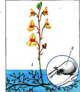 меняется в небольшие округлые ловчие пузырьки диаметром 2-3 мм (рис. 55). Пузырек имеет входное отверстие с клапаном, который открывается только внутрь. Вблизи входного отверстия расположены два ветвистых волоска, похожие на усики мелких водных рачков. Волоски колеблются, и охотящиеся за рачками мелкие водные животные подплывают к входному отверстию пузырька в надежде поймать добычу. Током воды они втягиваются внутрь пузырька. Выплыть они не могут, поскольку клапан наружу не открывается. Внутри пузырька животные погибают, продукты разложения всасываются железками, расположенными на внутренней поверхности пузырька. Как и росянки, пузырчатки за счет хищничества получают дополнительное ] [итание.