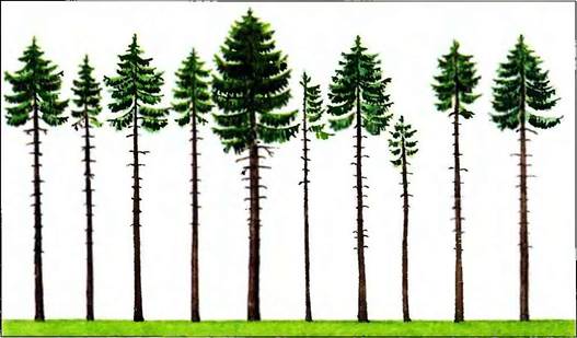ковые ветви. Плоская крона лучше улавливает свет, которого не хватает молод! [м елочкам под тенью взрослых деревьев. Полувзрослые елочки в лесу угнетены, и их размеры не превышают размеры крупных травянистых растений, например папоротников. Живущие в лесу полувзрослые елки-зонтики к 40-50 годам чаще всего погибают. Однако если в лесу возникнет осветленное место, называемое в народе «окном», эти угнетенные деревца могут перейти к быстрому росту. В «окнах» их кроны приобретают конусовидную форму. Ели начинают расти вверх, переходят во взрослое состояние, образуют шишки и дают семена. Проростки, юношеские, полувзрослые и совсем молодые деревья называют подростом. Обилие и состав подроста говорит об устойчивости леса. Присутствие подроста показывает, что в лесу есть взрослые деревья, приносящие всхожие семена. Молодые растения (см. § 45) — это своего рода резерв вида. Угнетенный в лесу подрост в случаях рубки, падения старых деревьев, ветровалов, словом, при любом прореживании и осветлении леса, pt зко повышает свое жизненное состояние, начинает быстро расти и сменяет погибшие или вырубленные деревья. Прореживание сельскохозяйственных посевов и посадок. Человек искусственно прореживает посевы и посадки культурных растений. Например, чтобы получить крупные корнеплоды свеклы, моркови, редьки, продергивают их молодые посевы и удаляют мелкие и слабые растения. В лесу подобное же изрежи^ание мы наблюдаем у деревьев, но оно идет само собой без помощи человека. Самоизреживание деревьев в лесу. В конкурентной борьбе побеждают деревья, растущие быстрее и образующие больше ветвей, листьев и корней. Они перехватывают у более слабых, медленно растущих свет, влагу, питательные вещества. В ходе конкуренции ослабленные деревья погибают и лес изреживается. Деревья с высокой жизненностью получают дополнительное пространство для развития своих крон и корневых систем, благодаря неоднородности деревьев по жизненности происходит их самоизреживание. Чем старше лес, тем крупнее деревья, тем больше места занимает каждое из них и тем реже они растут. Густота деревьев в еловых лесах зависит от возраста елей. Вспомните, как густо растут молодые елочки, как трудно пробираться через их чащу! А вот в старых ельниках, где деревьям за 60-100 лет, ходить легко и свободно, как в парке. Здесь деревья далеко отстоят друг от друга. Подрост. Самоизреживание 1. Какое значение для жизни леса имеет разнообразие одновозрастных деревьев по жизненному состоянию? 2. Почему происходит самоизреживание деревьев в лесу? Каковы последствия самоизреживания? 3. Что представляет собой подрост деревьев в лесу? Почему важно знать состав и обилие подроста?