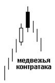 Образуется двумя контрастными свечами с одинаковыми ценами закрытия. Подобна моделям «Просвет в облаках» и «Завеса из темных облаков», также состоит из той же комбинации свечей. В «контратаке» второе тело не накладывается на первое, поэтому у модели «просвет» и «завеса» более сильные сигналы. Бычья контратака похожа на модель «в основании», но белая бычья контратакующая свеча открывается значительно ниже (она значительно длиннее), поэтому «контратака» - модель разворота, а «в основании» – модель продолжения тенденции. Главное условие заключается в том, что цена открытия второй торговой сессии значительно ниже (бычья контратака) или выше (медвежья контратака) предыдущей свечи.