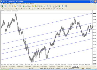 Канал Фибоначчи (Fibonacci Channel) Каналы Фибоначчи (Fibonacci Channel) строятся с использованием нескольких параллельных линий тренда. Для построения инструмента используются канал, ширина которого принимается за единицу. Затем наносятся параллельные линии на расстоянии значений ряда Фибоначчи, начиная с 0,618-кратного размера канала и далее 1,000-кратного, 1,618-кратного, 2,618-кратного, 4,236-кратного и так далее. Как только заканчивается пятая волна, можно ожидать коррекции в направлении, противоположном тренду. Для правильного построения Fibonacci Channel необходимо помнить: при восходящем тренде базовая линия ограничивает верхнюю часть канала, а при нисходящем — нижнюю.