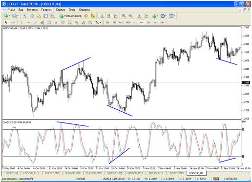 Следует заметить: как и все осцилляторы, Стохастики хорошо работают на флэтах или слабонаправленных коридорах, но дают много ложных сигналов на ярко выраженных трендах. Варианты работы. - Divergence. Уровни перекупленности (overbought) и перепроданности (oversold). Самые лучшие результаты в боковом тренде. Правила использования: - Сильно опережающий индикатор. - Уровни перекупленности и перепроданности используются в боковом тренде. - Divergence используется для определения раннего окончания тенденции, лучший вариант для закрытия позиций. - Точки пересечения %K и %D можно использовать в трендовом рынке, только при совпадении сигналов индикатора и направления тренда. Особенности анализа стохастиков: - пересечение %K и %D может являться хорошим сигналом для сделки; - два подряд разнонаправленных их пересечения говорят, что первый сигнал был преждевременным и возможно возобновление предыдущего, причем более сильного, движения цены; - сигналы из зон перекупленности (перепроданности): для %K и %D - 70-80 (30-20), для %R - 90 (10); - быстрая линия (%К) пересекает медленную (%D) снизу вверх – покупка; - быстрая пересекает медленную сверху вниз – продажа; - направления обоих линий совпадают - дают направление динамики тренда; - линии разнонаправлены - непонятная ситуация.