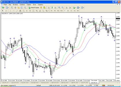 Все рынки характеризуются тем, что в течение большей части времени цены на них сильно не меняются и лишь в течение небольшого времени (15–30 процентов) наблюдаются трендовые изменения. Наиболее благоприятны для извлечения прибыли периоды, когда цены на рынках изменяются в соответствии с определенным трендом. Фракталы (Fractals) — это один из пяти индикаторов торговой системы Билла Вильямса, позволяющий обнаруживать дно или вершину. Техническое определение фрактала вверх — это серия из пяти последовательных баров, в которой перед самым высоким максимумом и за ним находятся по два бара с более низкими максимумами. Противоположная конфигурация (серия из пяти баров, в которой перед самым низким минимумом и за ним находятся по два бара с более высокими минимумами) соответствует фракталу вниз. На графике фракталы имеют значения High и Low и отмечены стрелками вверх или вниз. Сигналы технического индикатора Fractals необходимо отфильтровывать с помощью технического индикатора Аллигатор. Другими словами, не следует заключать сделку на покупку, если фрактал находится ниже Зубов Аллигатора, и не следует заключать сделку на продажу, если фрактал находится выше Зубов Аллигатора. После того, как сигнал фрактала сформирован и имеет силу, что определяется его позицией вне Пасти Аллигатора, он остается сигналом до тех пор, пока не поражается, либо до той поры, пока не возникает более свежий сигнал фрактала.