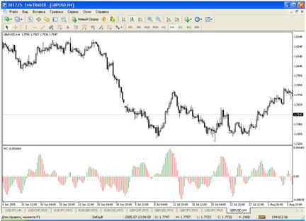 Из рисунка видим, как работает индикатор «ФРАКТАЛЫ» при выставлении отложенных ордеров на 4 часовом графике, происходит пробите ценой, уровня. Такая методика работает на всех валютных парах, и все временных периодах, только на каждом периоде свои стоп-лоссы и профиты. К примеру на 15 минутном графике, вам прийдется войти в рынок 15-20 раз в сутки, при этом будут и стоп лоссы и профиты, но как показывает практика, профитов больше, что позволяет нам оставаться в плюсе.Работая на 4 часах, необходимо отслеживать рынок каждые 4 часа.Только не забывайте, фракталы на BUY рисуются по цене BID, поэтому не забывайте прибавлять спрэд. Accelerator/Decelerator Oscillator-AC Цена - это последний элемент, который изменяется. Прежде чем изменится цена, изменяется движущая сила рынка, а перед тем, как движущая сила изменяет свое направление, ускорение движущей силы должно замедлиться и дойти до нуля. Затем она начинает ускоряться в противоположном направлении до тех пор, пока цена не начнет изменять свое направление.Технический Индикатор Ускорения/Замедления (Acceleration/Deceleration, AC) измеряет ускорение и замедление текущей движущей cилы. Этот индикатор будет изменять направление перед изменением движущей силы, а она в свою очередь будет изменять свое направление перед изменением цены. Понимание того, что АС является более ранним предупреждающим сигналом, дает очевидные преимущества.Нулевая линия - это, по существу, место, где движущая сила сбалансирована с ускорением. Если Осциллятор Ускорения/Замедления (Acceleration Deceleration, AC) выше нуля, то обычно бывает легче для ускорения продолжить движение наверх (и - наоборот, когда ниже нуля). В отличие от Аwesome Оscillator, пересечение нулевой линии не представляет собой сигнала. Единственное, что необходимо делать, чтобы контролировать рынок и принимать решения - это следить за изменением цвета. Чтобы избежать серьезных размышлений, необходимо помнить: при помощи АС нежелательно покупать, когда текущий столбец окрашен в красный цвет, и нежелательно продавать, когда текущий столбец окрашен в зеленый цвет.Если входить в рынок в направлении движущей силы (индикатор Acceleration/Deceleration выше нуля, при покупке, или он ниже нуля, при продаже), то необходимы только два зеленых столбца, чтобы купить (два красных столбца, чтобы продать). Если движущая сила против открываемой позиции (индикатор ниже нуля, при покупке, или выше нуля, при продаже), необходимо подтверждение, поэтому требуется дополнительный столбец. В этом случае необходимо, чтобы индикатор показывал три красных столбца выше нулевой линии, для короткой позиции и три зеленых столбца ниже нулевой линии, для длинной.