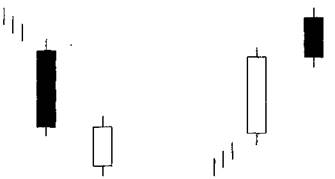 Рис.3-44 Фигура «Две Взлетевшие Вороны» переходит к свече, чье белое тело слегка длиннее, чем белое тело первого дня, и имеет длинную верхнюю тень (рис. 3-44). Тот факт, что это точно не медвежья свеча, предполагает, что необходимо некоторое дальнейшее подтверждение, прежде чем действовать согласно этой фигуре. I*