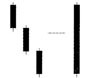 Рис.3-62 Как и фигура «Три Черные Вороны», фигура «Именгичные Три Вороны» переходит h длинной черной свече (рис. 3-62). Она полностью поддерживает медвежью склонность этой фигуры. «ПРОРЫВ» (хандре сайте но шинте иукэ) Подтверждение рекомендуется, особенно для медвежьей фигуры «Прорыв».