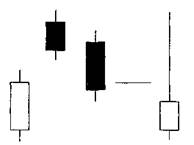 Рис.3-68 Фигура «Две Вороны» переходит к возможной фигуре «Падающая Звезда» (рис. 3-68). Это поддерживает медвежью склонность фигуры «Две Вороны». «ТРИ ВНУТРИ ВВЕРХ» И «ТРИ ВНУТРИ ВНИЗ» (карами are и харами гаге) Подтверждения не требуется.
