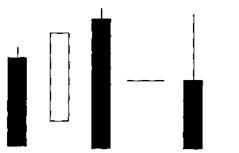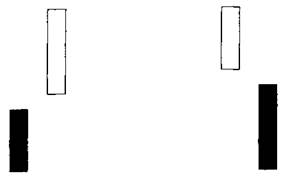 Рис.3-82 «Бутерброд» переходит к «Перевернутому Молоту», так как тело первого дня значительно меньше, чем рэндж третьего дня (рис. 3-82) Если первый день является маленьким телом, а ценовой рэндж третьего дня (сверху до низу) в два или три раза больше рэнджа первого дня, эта фигура переходит к бычьему «Перевернутому Молоту». Однако, если этого не происходит, «Бутерброд» переходит к черной свече, которая обычно имеет медвежью склонность. В результате предполагается подтверждение. «УДАР» (кери аши) Подтверждения не требуется.