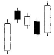 Гибкость фигуры Сценарии и психология за фигурой Правила определения 1. На восходящем рынке формируется длинный белый день. 2. Скачок вверх с более низким уровнем закрытия на второй день формирует день, немного похожий на звезду 3. Следующие два дня являются днями реакции, похожими на «Метод Трех Повышающихся Свечей». 4. Пя1ый день является белым днем с новым верхом закрытия. Рынок продолжает повышение длинным белым днем, подтверждающим бычье действие. На следующий день цены делают скачок к открытию и торгуются в маленьком рэндже только затем, чтобы закрыться на чут ь более низком уровне. Этот уровень (ниже, чем уровень открытия) все еще является новым верхом закрытия этого движения. Быки только отдохнули, даже если действие цены пробуждает медведей. Следующие два дня вызывают некоторое беспокойство, что восходящее движение может быть в опасности. Эти дни открываются примерно на том уровне, где рынок закрылся в предыдущий день, и затем закрываются слегка ниже. Даже к третьему такому дню рынок все еще выше, чем при открытии в первый день (длинный белый день). Склонность к тому, что перелом не сработал, растет, и цены снова повышаются, чтобы закрыться на новом уровне. Это полностью подтверждает мнение быков о том, что ситуация была паузой при сильном восходящем тренде. Расположение трех маленьких черных дней покажет последовательные понижения, как и «Метод Трех Понижающихся Свечей». Дни реакции все равно выше, чем в фигуре «Метод Трех Повышающихся Свечей».